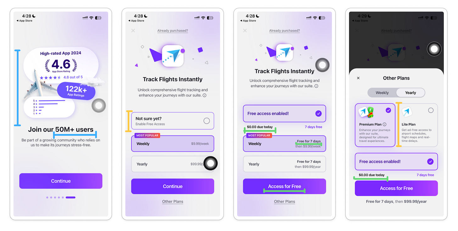 When the âFree Trialâ is enabled, the paywall content updates with phrases like â$0.00 due todayâ, âFree for 7 daysâ, and âAccess for freeâ. These are all great objection-handling copies for a âneed-more-convincingâ type user base.