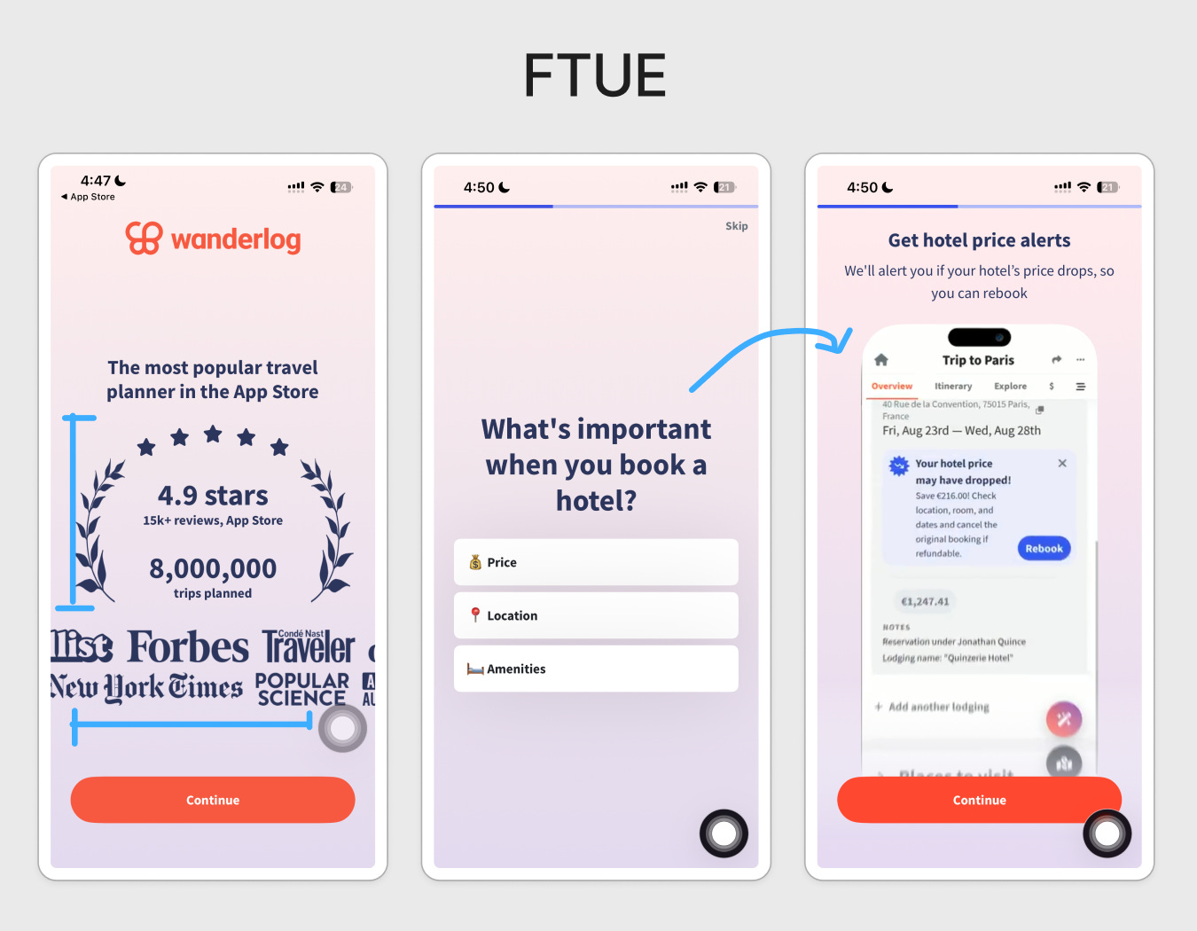 FTUE is designed to get people on board by leveraging the bandwagon effect. They throw around specific numbers like âwe found 102,192 travelersâ, and â+1M travelersâ along with traditional app reviews.