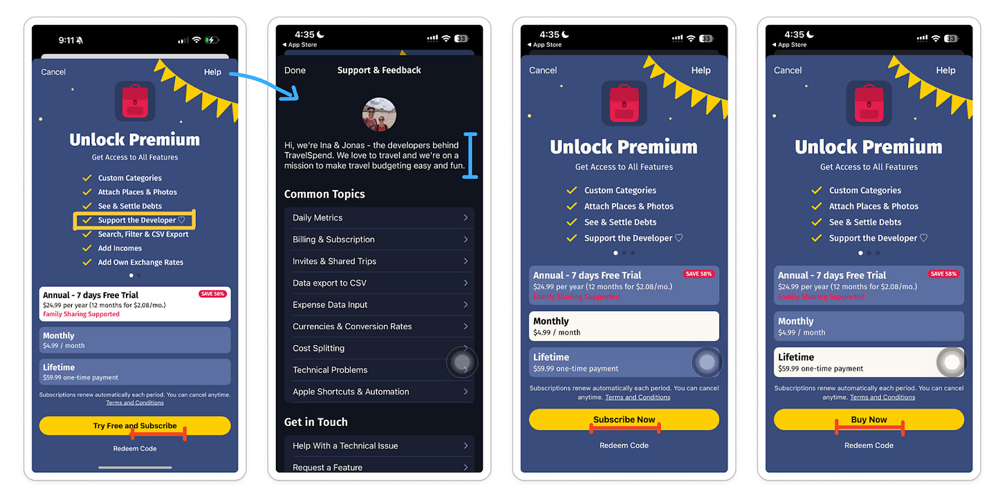 âSupport the devâ on the âwhat you getâ checklist is interesting. A tap on the little âHelpâ button on the paywall lets users discover the founderâs story behind building Travelspend.