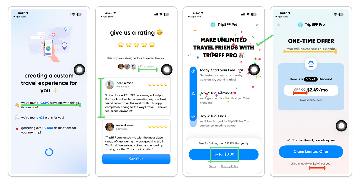 The paywall title âMake unlimited travel friendsâ is the only promise/selling point here. At this point, most users [if not all] do not 100% realize which specific perks they get to unlock. It wasnât specifically mentioned anywhere before this trial timeline paywall.