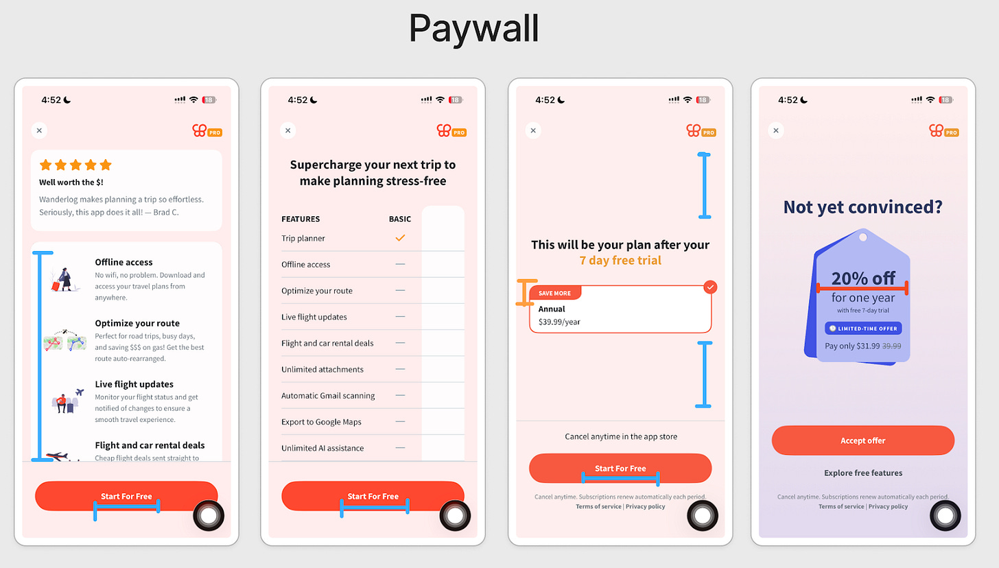 Multi-page paywall allows Wanderlog to break down âpro features+benefitsâ information into short, easily digestible segments.